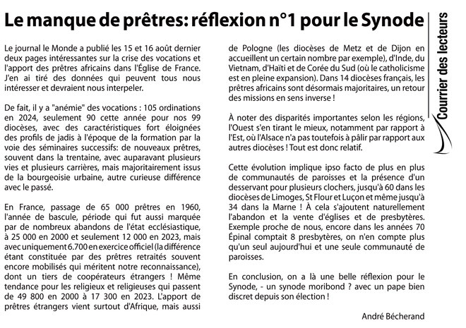Vous avez apprécié un article ou bien vous avez été marqués par un événement, un temps fort vécu en paroisse; vous souhaitez apporter votre propre témoignage, votre propre réflexion, alors, en quelques phrases, exprimez votre avis, donnez votre sentiment, posez les questions qui vous interpellent. Vos articles seront publiés et trouveront sans doute écho auprès d’autres lecteurs.